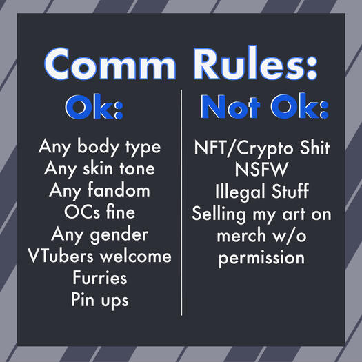 1. Do not reprint my art, or post without credit. I do not give commercial rights (aside from just displaying for social media/schedules/icons/stream assets/etc) to my art, so don't make separate merch of my art.2. Do not resell my art. If you decide to sell your vtuber or something, do not include my art as an asset.3. I will have a consultation with you first to make sure I am capable of making the thing you want me to make. If you have refs for poses, personal sketches, etc, that makes things loads easier! Also, just tell me if you don't like something so I can fix it. If I'm 50% done, it'll be harder to fix your comm and I may charge more for extensive revisions.4. I will take all payment after the consultation phase. I use ko-fi for simple comms, and stripe invoices for more complicated comms. If something comes up and you would like to cancel later on, depending on how much work has been done I will offer a refund.Refund schedule-